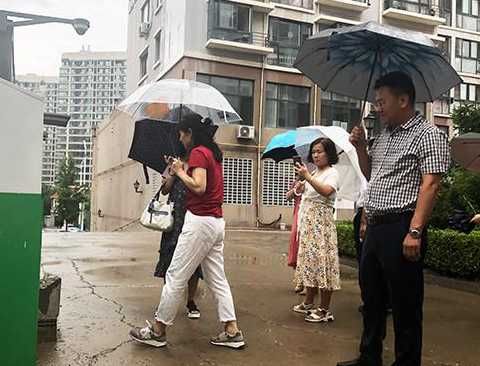 烟台市民政局副局长王信培(右)检查“旧衣服回收箱”整改情况