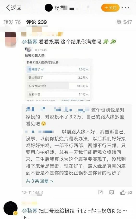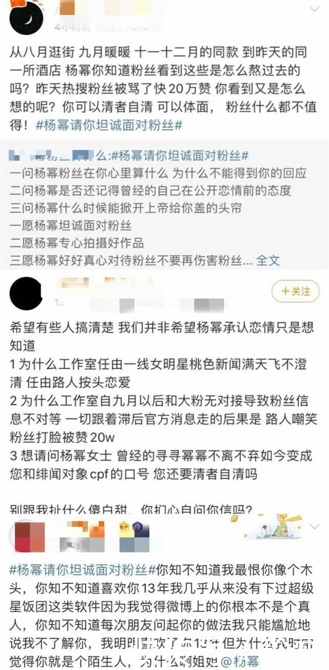 最近,关于杨迷你和魏大勋的事情在网上广为流传,但双方都没有公开自己的声音,这让粉丝们一刻也坐不住。最近,就连迷你杨的一些粉丝也觉得难以接受,并选择摘掉粉饼。他们还发布了一份询问杨迷你的文件。可以看出,丑闻已经对球迷产生了很大的影响,甚至有13岁的球迷已经摘掉了粉饼。然而,对于普通人来说,很难理解为什么偶像爱好者不能忍受它。