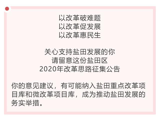 从现在起至2019年12月19日,全区机关事业单位工作人员、工作和生活在盐田的群众、关心和支持盐田发展的各界人士可以通过以下三种方式参与征集活动:1。加入-登录“盐田政府在线”,点击“互动交流”-“征求意见”-“关于征求盐田区2020年改革意见的公告”填写并提交。