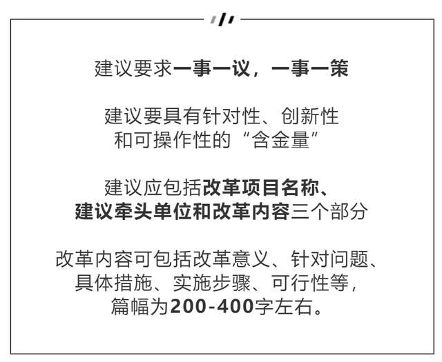 当然,市民和朋友也可以自行提出切实可行和有价值的新的改革思路和建议,并附上相关的推广思路和创新措施。为了提高征集效率,盐田区发展研究中心(区改革办)对改革建议给出了明确的指导方针: