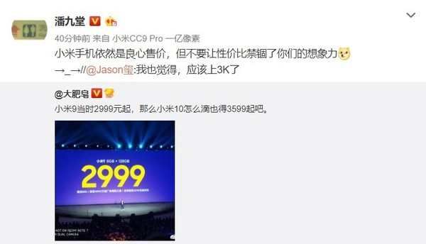 小米10价格推测小米10的价格是多少?网友在微博上预测:小米9当时起价2999元,那么小米10怎么也能起价3599元呢?小米产业投资部合伙人潘九堂转发了回复:小米手机仍然是良心的代价,但不要让性价比禁锢你的想象。