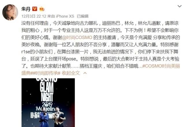盛大仪式结束后,朱丹在社交平台上连续三次向林允、古力娜扎、迪丽热巴等道歉,说他不应该犯错,他对犯错误感到沮丧和难过,甚至说他应该战斗。他沉默了很长一段时间,然后发出另一个动态信息,他不想在沮丧中睡着,这似乎是对他的错误的深刻认识。