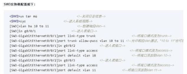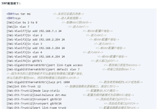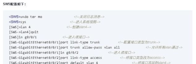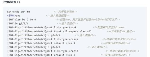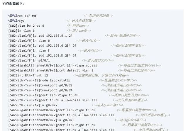 由于SW6、SW7和SW5的配置彼此相差不大,它们都改变接口类型,创建相应的虚拟局域网,向虚拟局域网添加接口,中继接口允许所有虚拟局域网的信息通过。因此,SW6和SW7不写注释,相应的注释可以参考SW5的配置。SW6配置如下:
