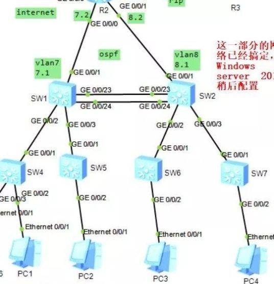 第一部分从R2路由器的GE0/0/0和GE0/0/1开始,依次配置路由器接口IP地址、OSPF、三层交换机接口、vlan、链路聚合配置、第二层交换机接口配置和vlan划分。最后,它测试最低的计算机是否可以ping路由器的GE0/0/0接口(在ping之前,您需要配置OSPF)。