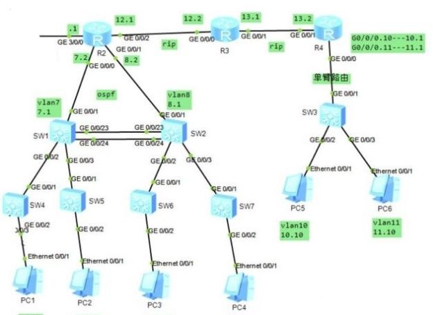 R2是公司的网关路由器,R1模拟公共网络路由器,因此无法配置到公司内部的路由。公司内部网中使用两种动态路由协议。SW1和SW2采用R2和OSPF动态路由的RIP和OSPF、GE0/0/0和GE0/0/1接口,属于区域0。R2的GE0/0/2以及R3和R4都使用动态路由协议RIP。因此,R2路由器需要重新分配路由。以便不同的路由协议相互学习。作为网关路由器,R2需要到公共网络的默认路由,并且需要将该默认路由重新分发到OSPF和RIP协议。