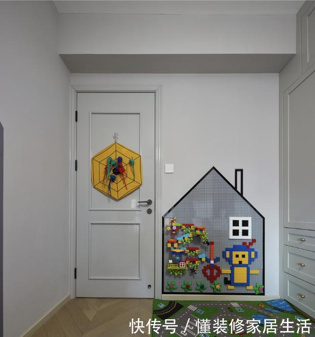 因此,业主决定不使用传统的装饰电视墙,而是用一面储物墙代替原来的电视墙。四个圆圈为灰色定制橱柜,中间区域配有红茶镜面玻璃门,可以满足储物功能,使橱柜更加层次化。打开后,您可以存储经常访问的项目,如家庭成员常用的小工具、儿童出版物等。其余的橱柜可以存放大量儿童玩具。