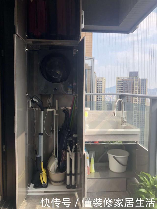 阳台供洗衣和烘干。它不是完全封闭的。阳台扶手上方安装隐形防盗网,透气,能保证安全。这边有洗衣机和烘干机。