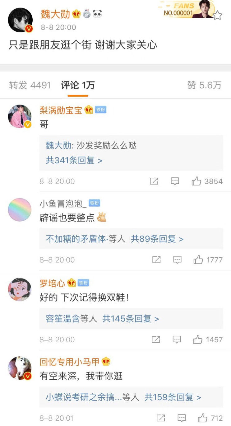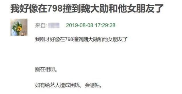 8月8日,一名网民贴出了一张与魏大勋偶然相遇的照片。他旁边还有一个女性朋友。这两个人看起来很亲密,穿着情侣鞋。网民说他们是“他的女朋友”,这引起了每个人的猜测。