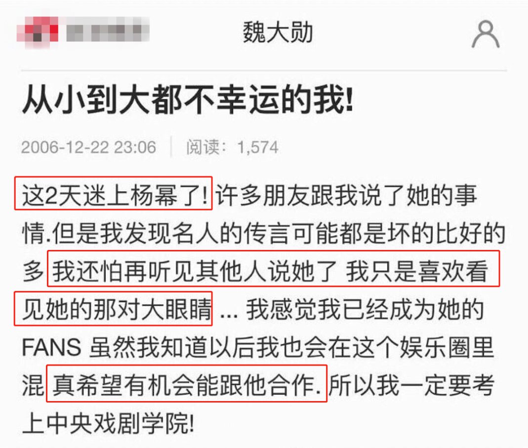 一些网民还拿起了魏大勋2006年写的一篇文章,当时魏大勋还没上大学,他说自己迷上了杨迷你,也是杨迷你的粉丝。他害怕听到别人说她不好,喜欢小杨的大眼睛。他希望与她合作。