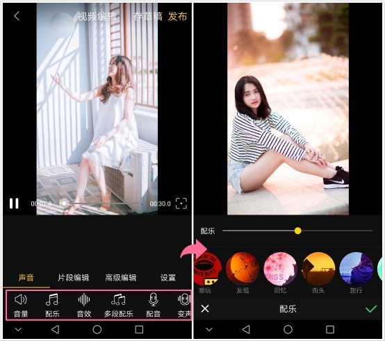 点击软件上的[音乐]功能,有多种声音编辑功能可供选择。你可以给视频配音或者改变声音。当然,最常用的功能是[音乐]功能。有许多独立的音乐,这是一些流行视频的常见音乐。~你可以随意添加~