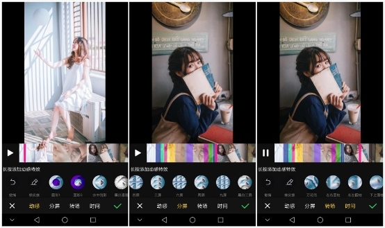 这里我们可以看到四种模式,即“动态”、“分屏”、“过渡”和“时间”。每种模式都有许多特效可供选择。~我们选择我们喜欢的特效,并长时间按下它,将特效添加到视频中的指定位置~