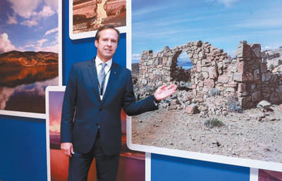 图为豪尔赫·基罗加在北京活动期间介绍玻利维亚自然风光。