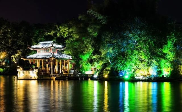 桂湖南北走向。湖边的老人山和刘妈山可以免费上山,俯瞰山水一体的美景。古城北部的龙牧湖有古松城墙和东镇门,这增添了一种怀旧的意味。两河四湖之夜格外明亮。