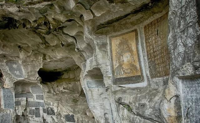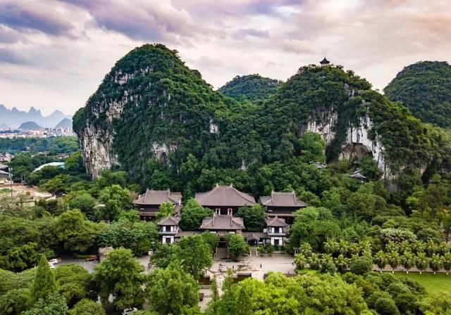 洞穴里还有一千块佛像,上面保存着300多尊悬崖雕像,大部分是晚唐时期的作品。最受欢迎的景观是河边被河水冲走的试剑石。上层岩石是颠倒的,离下层岩石只有一个手掌。山顶上有一个观景台,可以俯瞰群山环抱的桂林城市风光。
