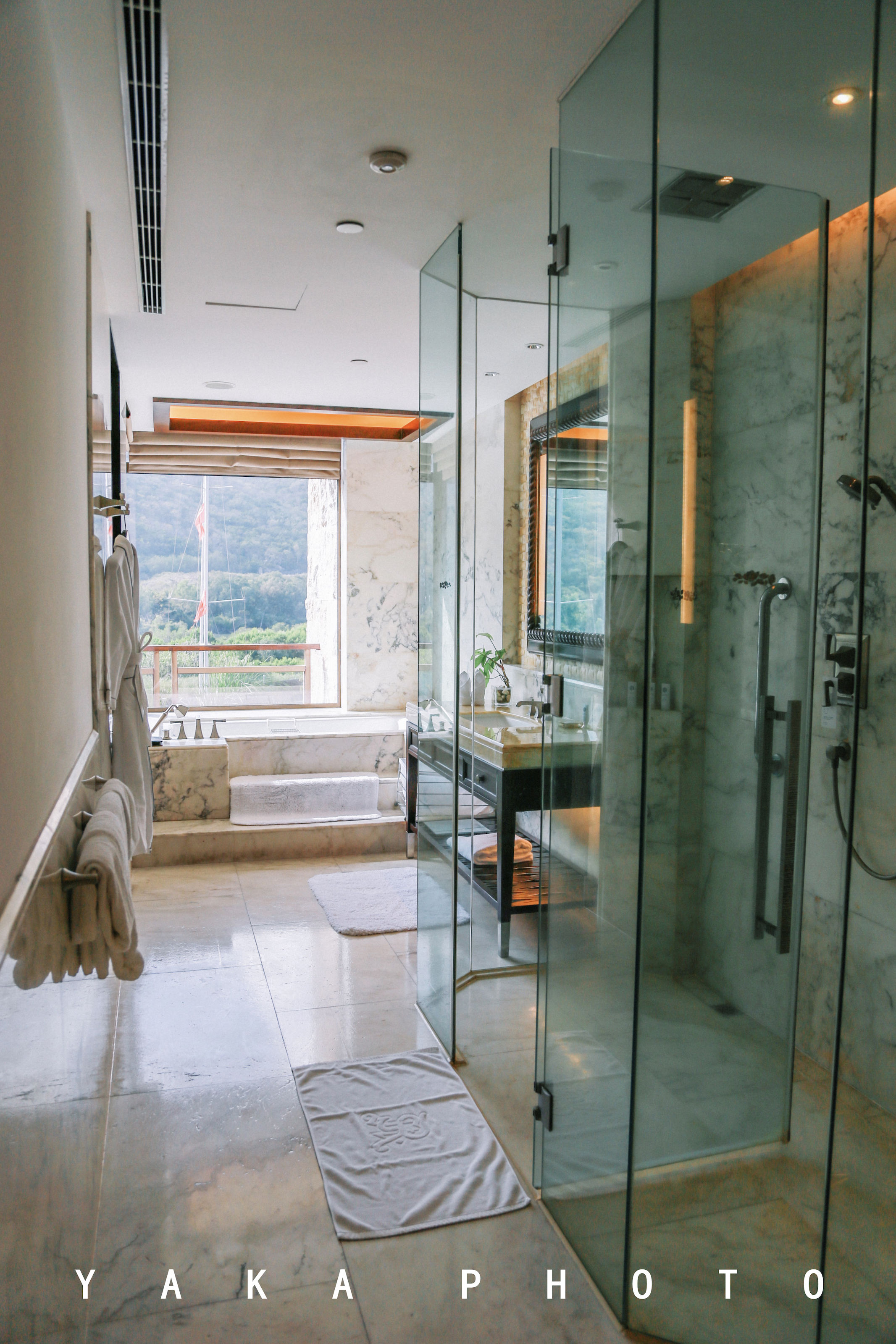来感受一下这个巨大的厕所。你可以一边洗澡一边看电视。外面还有一个阳台,你可以晒太阳,吹海风。