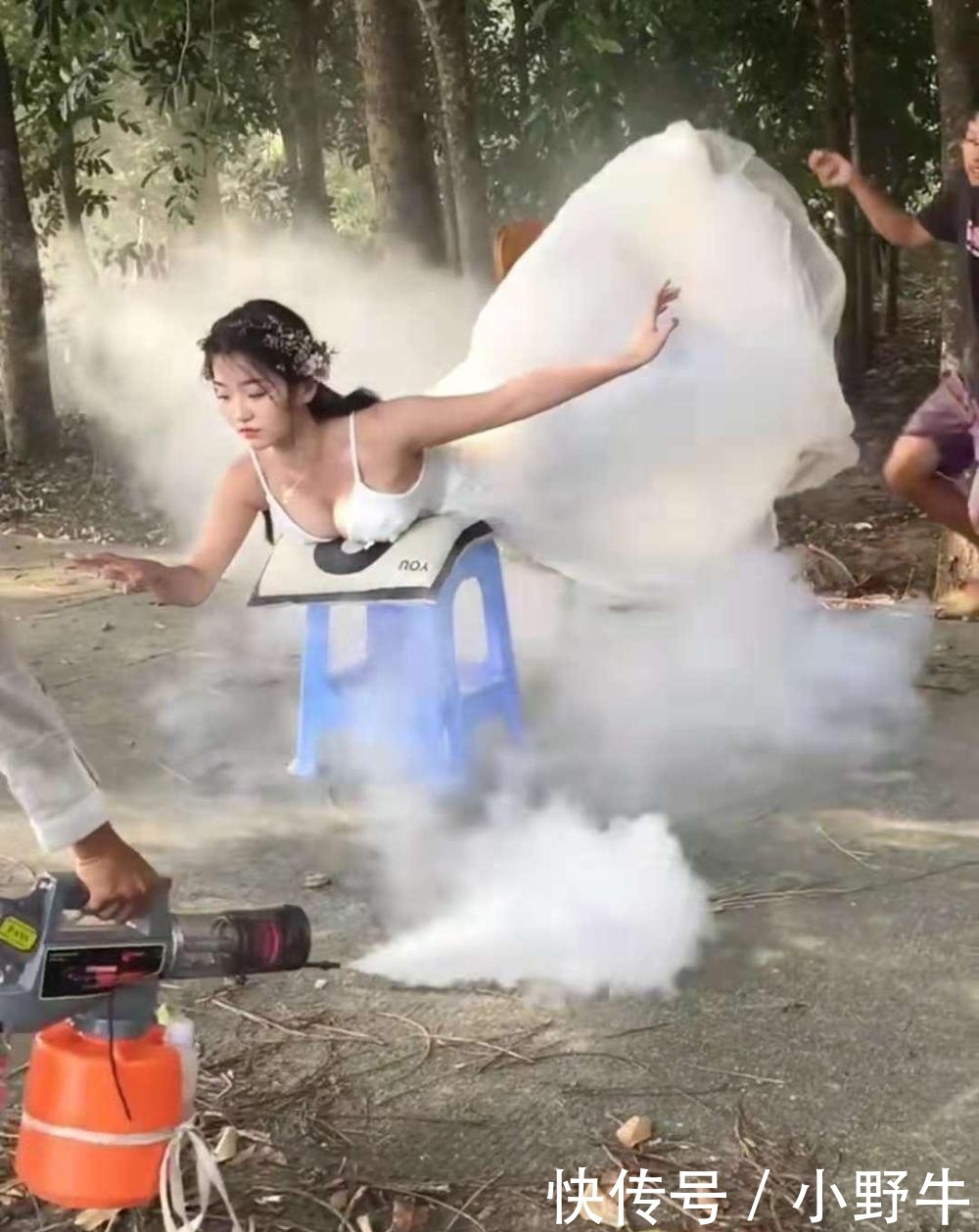 虽然照片是在这个时候拍的,但摄影师要求他们分开拍。这位迷人的摄影师也在拍摄过程中亲自演示。之后,新娘穿着吊带婚纱,躺在两把椅子上。她看起来很担心自己可能会失明,但她看起来很放松。然后她举起手向前伸,好像要触摸什么东西。前助手在她面前不停地抽烟,后助手为她挥动裙子。因为新娘优雅的姿势,这一幕看起来简单而美丽。