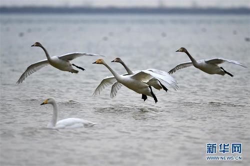 12月13日,白天鹅从山西平陆黄河湿地起飞。新华社记者展颜
