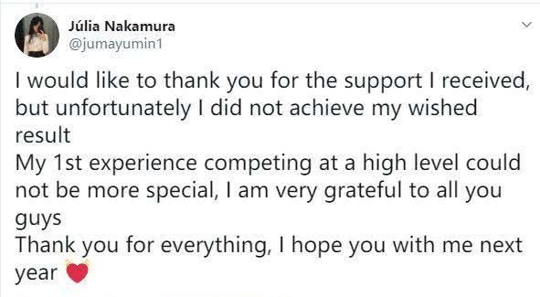 “我想感谢你的支持,但不幸的是,我没有达到我期望的结果。我的第一次高水平比赛真的很有意义,我真的非常感谢你们所有人。我希望明年每个人都能继续支持我!”
