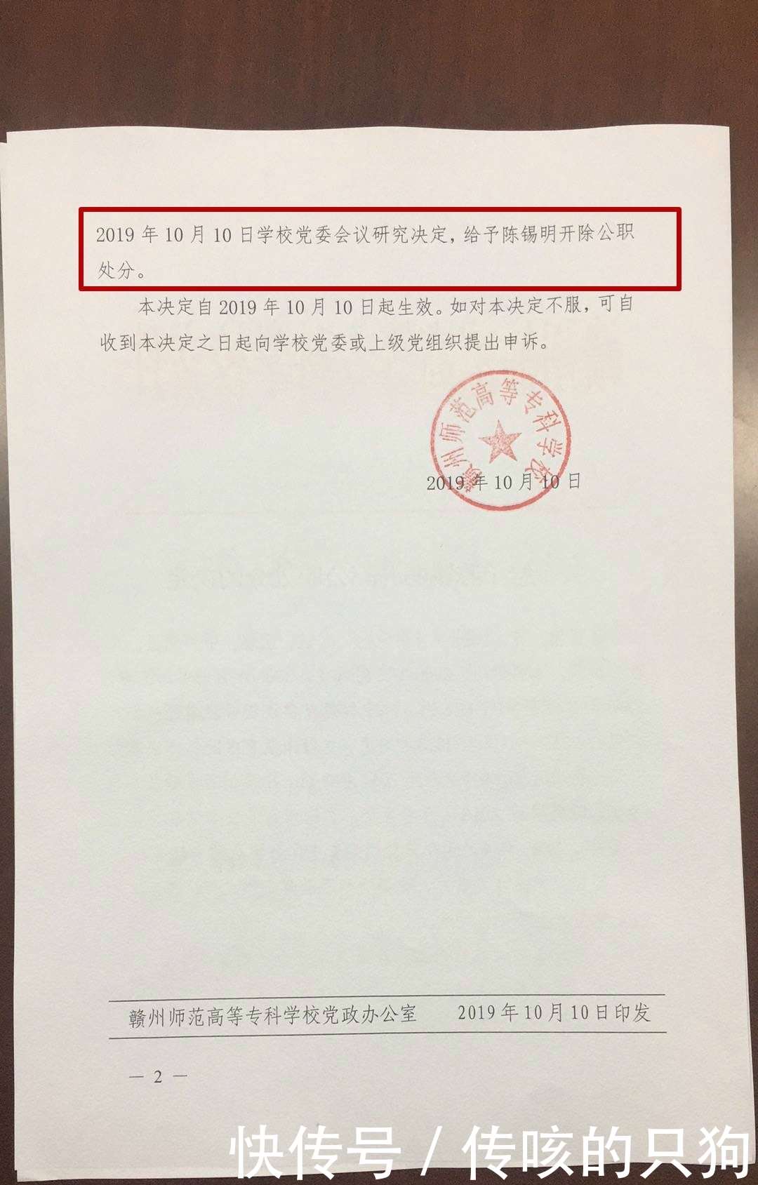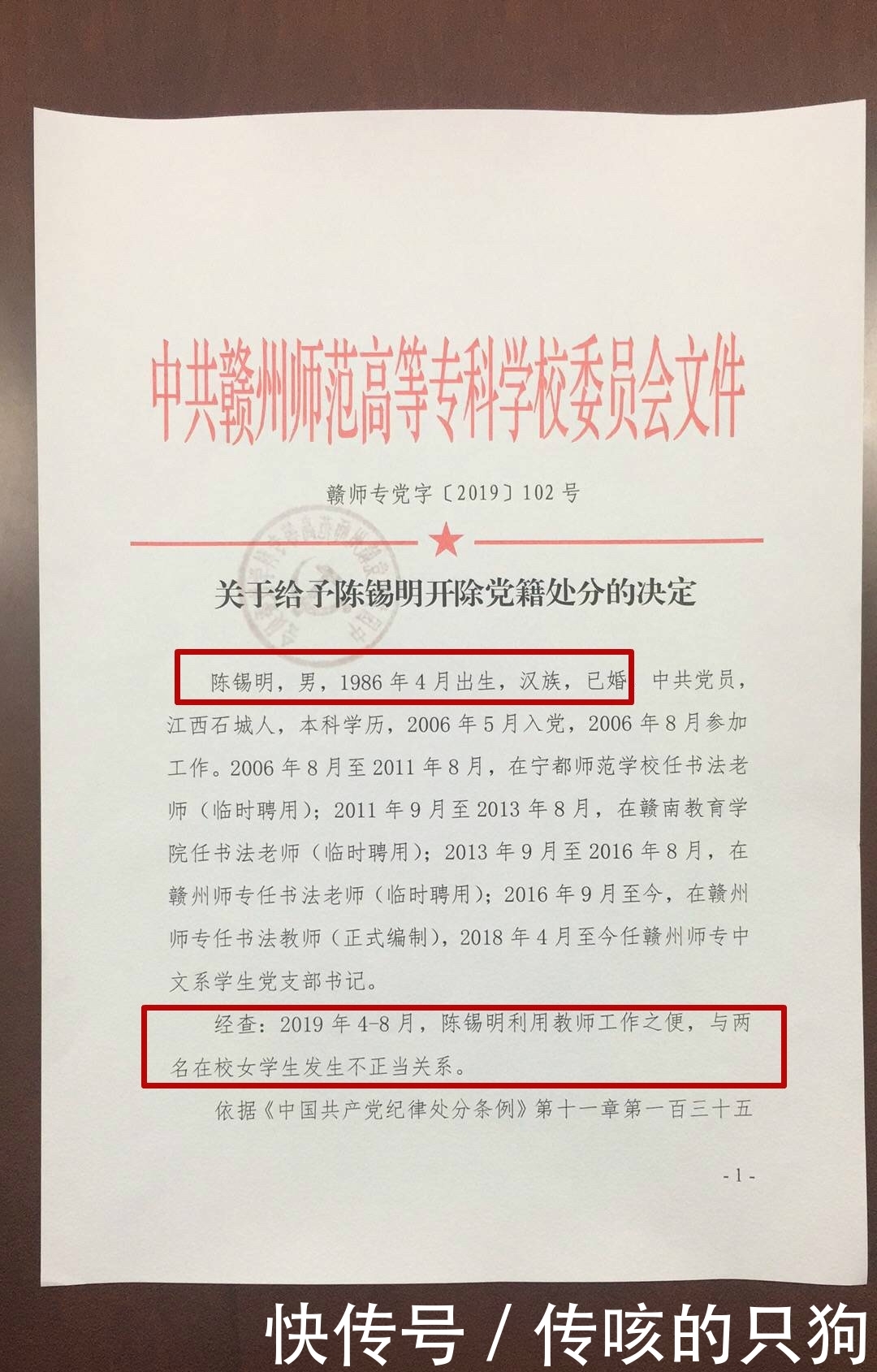 在线文件《关于开除陈羲明党籍的决定》称,经过调查,陈羲明于2019年4月至8月被开除党籍并被开除公职,原因是他利用了老师的工作机会,并且在学校与两名女学生没有适当的关系。本《决定》由江西师范学院党报[[2019]102号于10月10日发布,并加盖赣州师范学院红色公章。《决定》将于2019年10月10日生效。