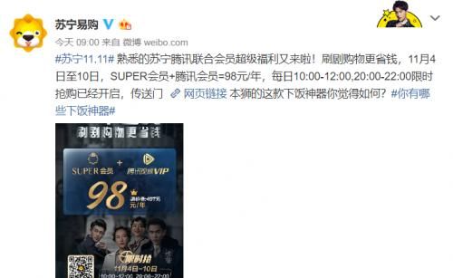 11月5日上午,苏宁微博官方宣布:苏宁腾讯联合会员推出超级福利,苏宁超级会员腾讯会员=98元/年。