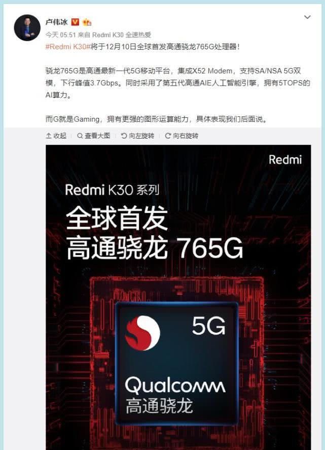 长期以来,三星和小米已经启动了小龙8系列的旗舰芯片,所以小米10启动小龙865也就不足为奇了。然而,令人惊讶的是,小米甚至开始了小龙765G的世界系列。就在小龙865和小龙765G发布后,魏兵正式宣布,红米K30将于12月10日在全球推出小龙765G芯片!