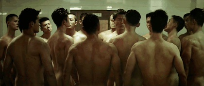 仔细看,它很凶猛。一个男人被一个女人包围,不得不脱下衣服。