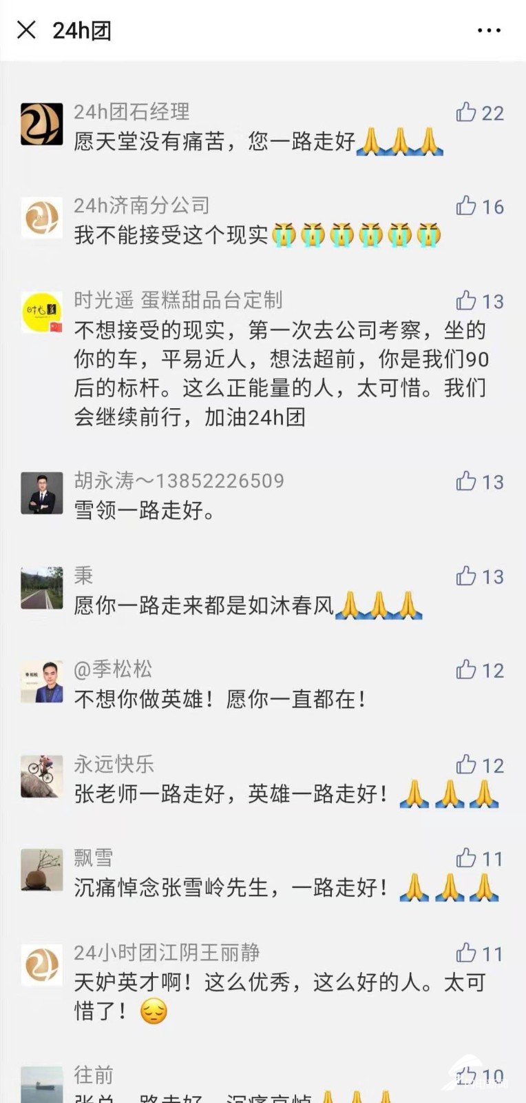 他的同事们也纷纷在公司的公众号下留言表达哀思。张雪领的同事刘铭告诉记者,张雪领很看重团队合作,他是一个心里能装得下别人,心里有爱的人。\r