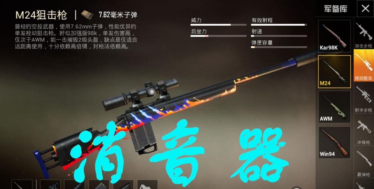 消音器这个配件也取决于使用的是什么样的枪械,因为这个配件并不提高枪械的任何属性,而只是降低枪械的声音,所以对于步枪来说,根本就没有玩家装备,如果使用狙击步枪,我相信玩家喜欢安装消音器,但是说到声音,任何装备消音器的枪械的声音都非常清脆,尤其是像M24这样装备消音器的狙击步枪,声音就像订书机工作时一样,所以消音器的声音在和平精英中是一件好事!