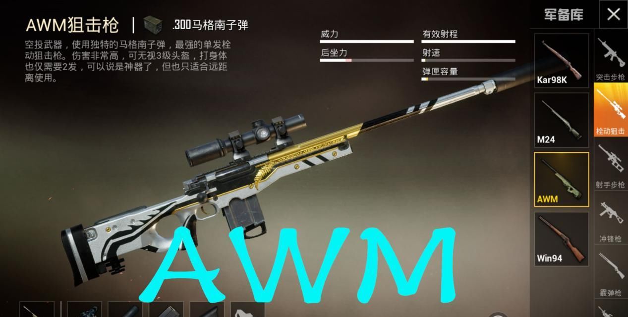 AWM,作为和平精英中面板伤害最高的武器,当然是玩家最喜欢的武器,AWM的声音也是独一无二的。可以说,装备了AWM狙击步枪,吃鸡的概率可以提高很多,无论是为了枪还是什么,拥有这把枪对其他人来说都是非常自信和正确的,而很多玩家听到马格南的声音也非常害怕。毕竟,它可以一枪爆头,所以AWM的声音是和平精英们非常好听的声音!