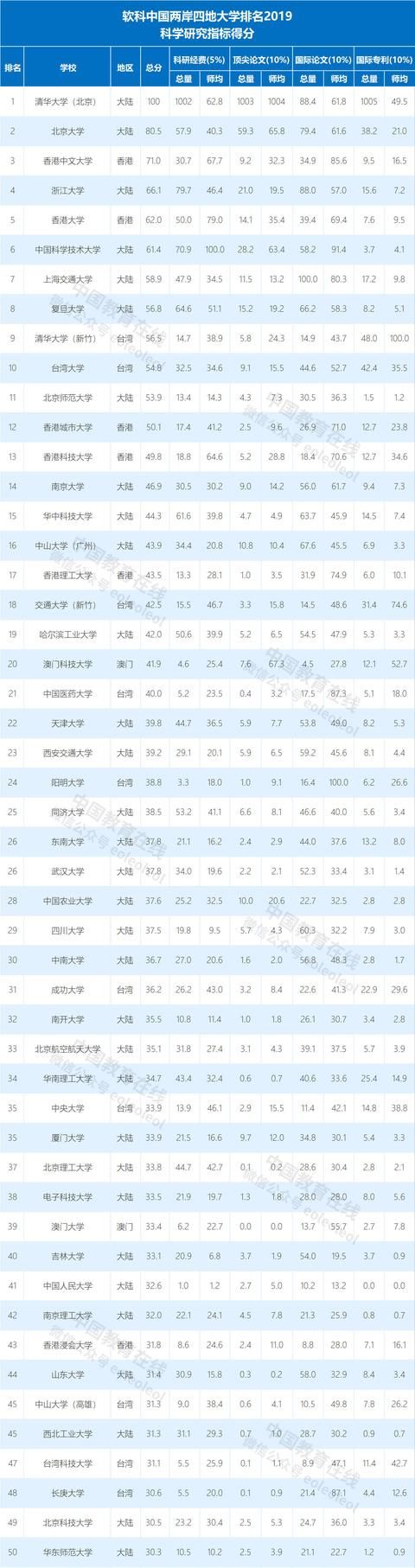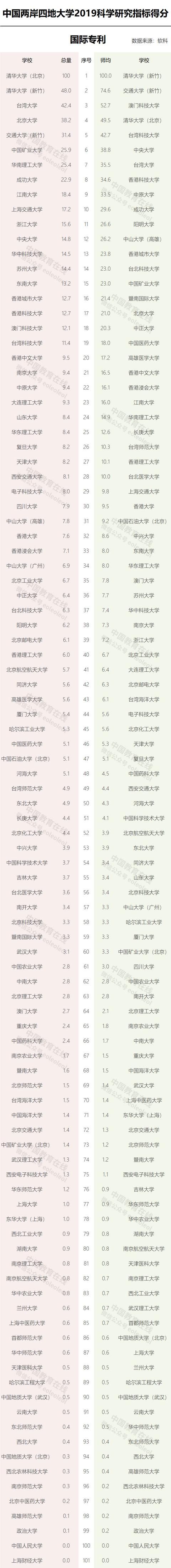 “国际专利”指数显示,清华大学(北京)总分第一,清华大学(新竹)得分第一。