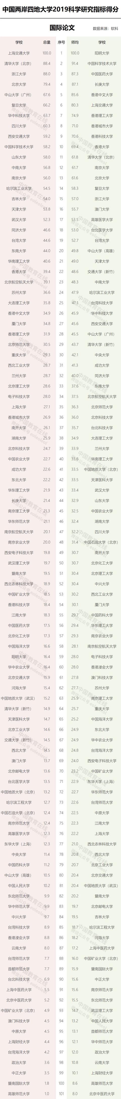 两岸四所大学2019年“国际论文”指标详细评分表;