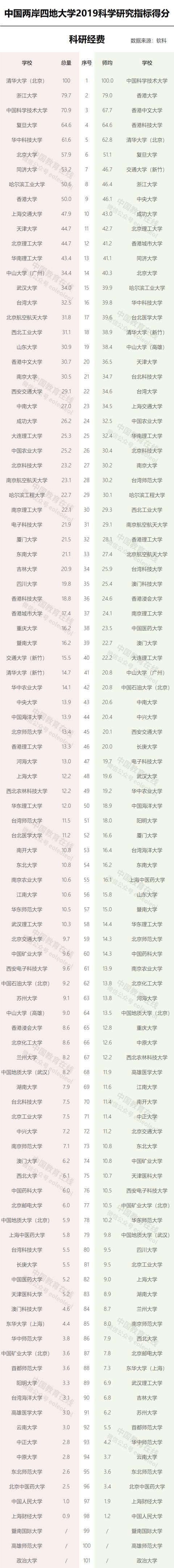 从可以看出,在 研究经费总额最高的10所大学中,9所是内地大学,1所是香港大学。然而,从教师的前10名研究经费来看,中国大陆有4所大学,港澳台有6所大学(港台各3所)。