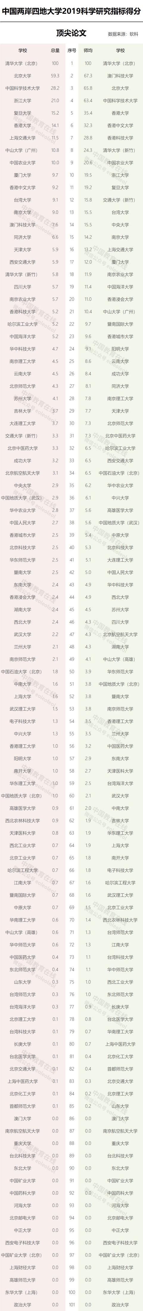 中国台湾海峡两岸四所大学2019年“顶尖论文”指标详细评分表: