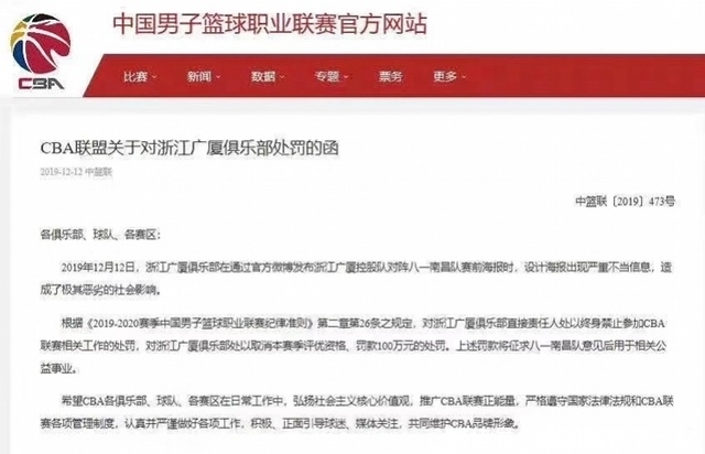 杜南新闻记者王亚云12月12日,CBA联赛官方网站发布处罚通知:对浙江广厦罚款100万元,取消其本赛季的评优资格。这是哥伦比亚广播公司历史上最重的罚款。