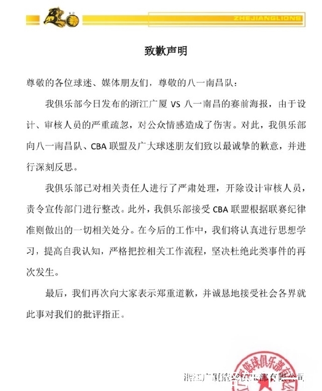 浙江广厦俱乐部发表道歉声明。