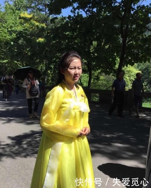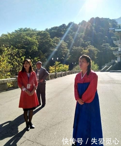 p图片展示了一位穿着民族服装的女性导游在朝鲜的一个景点,她的面部特征非常精致。/p