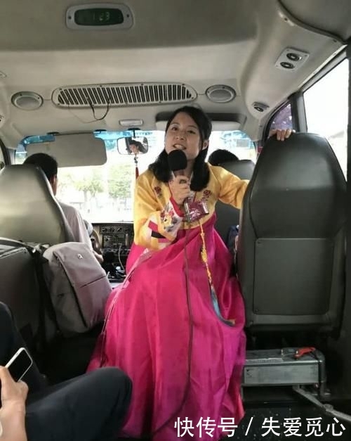 p图为一名身着民族服装的美丽导游在朝鲜旅游巴士上对着麦克风讲话。/p