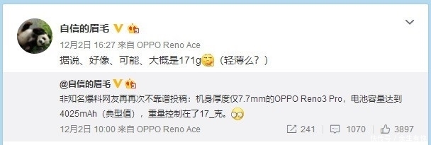 目前,市场上的5G手机都有笨重的共同缺点。然而,据OPPO副总裁沈正毅发布的信息显示,OPPO NO3系列将具有出色的轻薄特性:OPPO Reno3 Pro将采用前后双3D玻璃,厚度仅为7.7毫米,重量仅为171克,并配备4025毫安时的电池以确保足够的耐用性。据推测,OPPO Reno3系列将采用带孔全屏方案。与目前流行的机械结构相比,采用这种方案不仅减小了机身的厚度和重量,而且增加了机身的气密性。