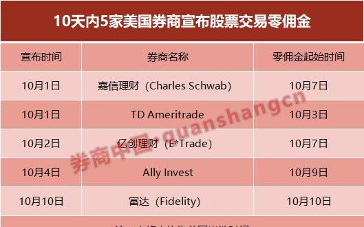 然而,当美国最大的网上证券公司查尔斯·施瓦布(Charles Schwab)10月1日宣布将股票、ETF和期权网上交易佣金从4.95美元下调至0美元时,整个金融业仍有点措手不及。随后,美国券商如道明美国(TD Ameritrade)、易趣(E*Trade)和未上市的AllInvest也纷纷效仿,将交易佣金降至零。