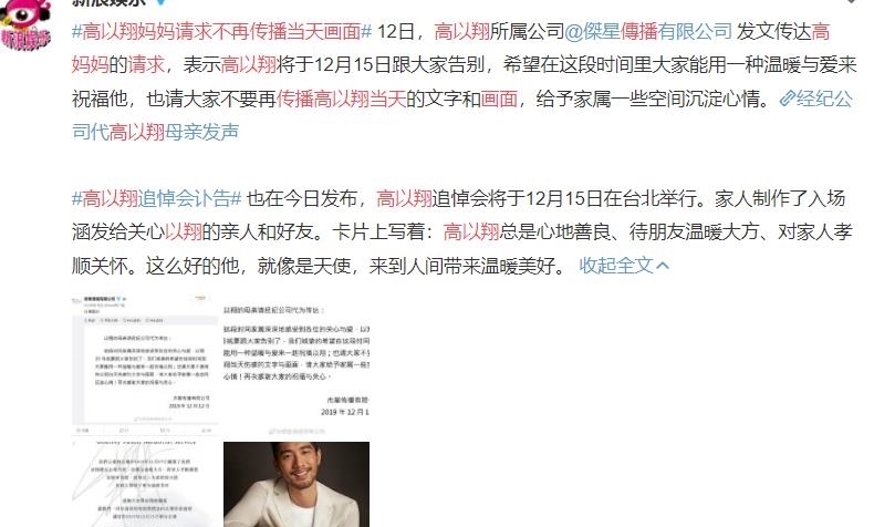 最近,网民们还传播了高以翔录制节目那天的视频图像。许多网民看到后说:我真的很难过。随着事件继续发酵。高的妈妈说,“向异15号要和你们所有人告别了。请不要再传递向异节的悲伤话语和照片,给这个家庭一些空安定下来。”