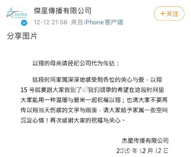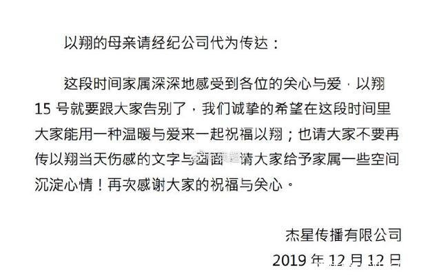 高以翔的母亲通过公司发布了这条消息。从新闻中可以看出,高以翔的家人受到外界各种谣言的困扰,而对于他们所熟悉的高以翔来说,这种情况并不是他们所希望看到的。发表声明确实是无能为力的。事实上,早在几天前,高以翔回到台湾后,他的母亲就要求他的朋友传达这样一个愿望,“高以翔的灵魂在漂浮,不能安心离开。我希望每个人都能传播积极的能量和祈祷”。