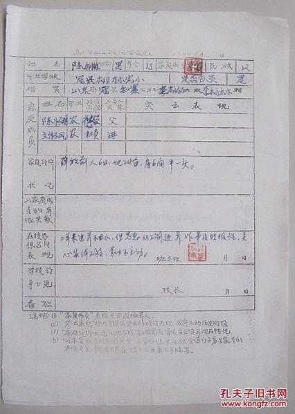 1965年7月冠县柳林完全小学陈树林毕业登记及政审表