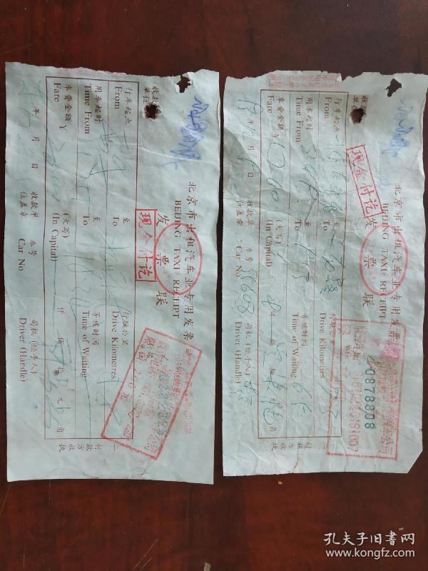 年代北京出租车手写发票两张,交通票证收藏的