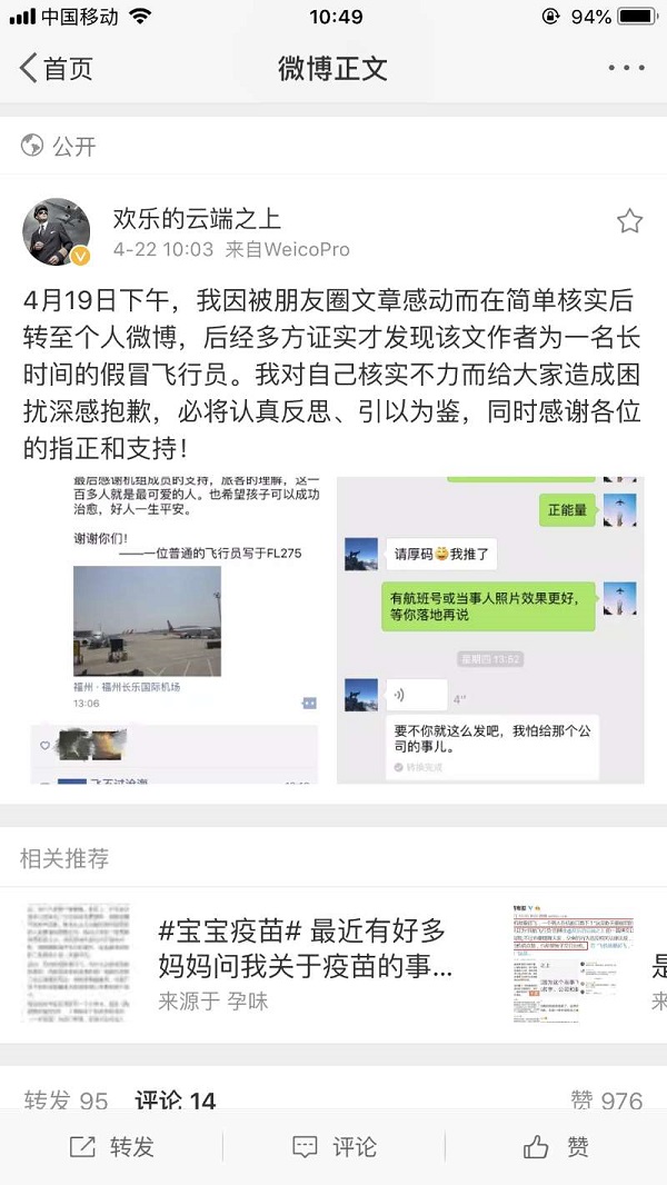 父亲跪舱门口微博首发者上午发声:上了假冒飞