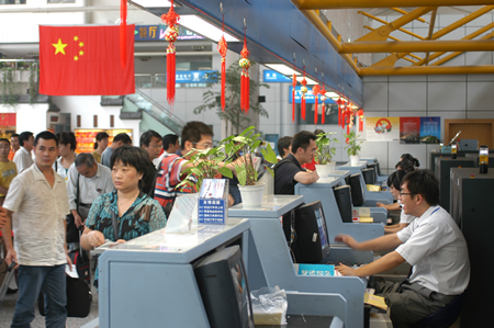 东航江苏公司值机柜台挂国旗庆双节(图)_产经