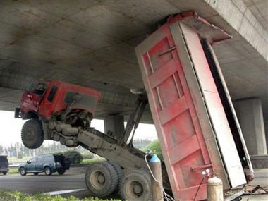 Truck jammed under bridge in Nanjing
