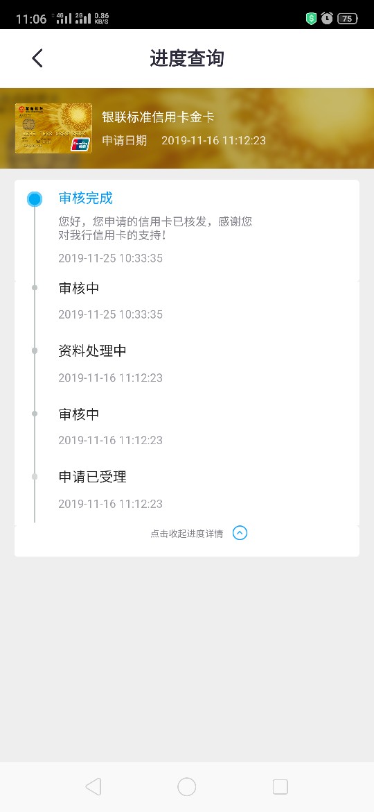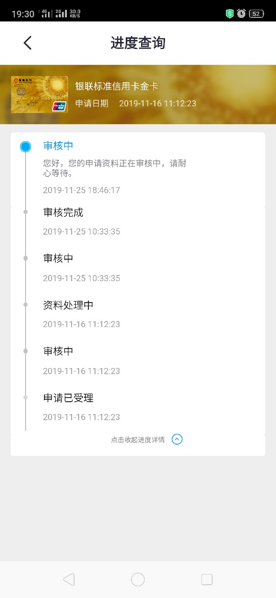 [最佳答案] 您好,从审核部门收到您的申请资料到信用卡完成审核一般需10个工作日。审核通过后,我们会在2个工作日内为您制作卡片,然后按照账单地址以挂号信的方式为您寄