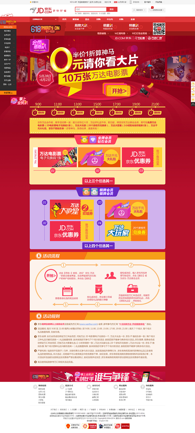 京东商城与万达影城合作,推出第一波活动,5月28日-6月2日电影票,优惠券免费领。金牌以上会员可以领取万达影票电子码1张(2D)、万达广场千元大