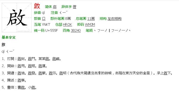 [最佳答案] 启拼音: [qǐ] 来自百度词典|报错 启_百度词典 [释义] 1.打开:~封.~门.某某~.~齿.2.开始:~用.~程.~运.3.开导:~迪.~发.~蒙.~示.~明(古代指太阳还没出来的时候,出现在东方天空的金星).承上~下.4.陈述:~事.5.书信:书~.小~.