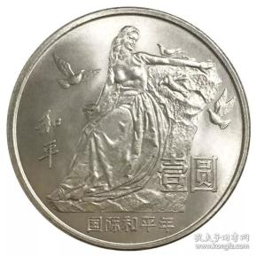 国际和平年纪念币于1986年发行,面值1元,直径30毫米,重量为9.32克,发行量2704.8万枚,铜镍合金材质,正面图案是国徽、国名及年号,背面是和平雕像